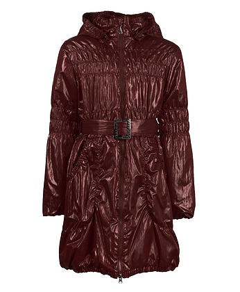 Плащ демисезонный утепленный (до 0 градусов), длиной до колен с застежкой на молнию (бегунки на молнии могут отличаться!), сверху прикрыта планкой, предохраняющая от соприкосновения с кожей. По талии ширина изделия регулируется поясом с декоративной пряжкой (пряжки могут отличаться!). 2 боковых кармана, присборенных на резинку. Низ изделия, рукава, верх воротника-стойки и край капюшона присборены на резинку, защищающую от ветра. Капюшон прикреплен к изделию кнопками. Все изделие с декоративными горизонтальными сборками.
